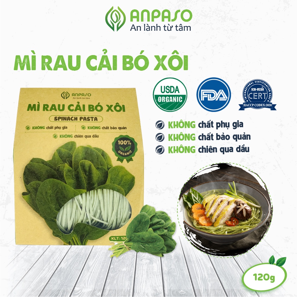 Freeship- Mì Rau Eat Clean Cải Bó Xôi Hữu Cơ Organic Anpaso, Giảm Cân, ăn chay, ăn kiêng, không chiên nóng, tốt cho tiêu hóa 120g mua tại đây